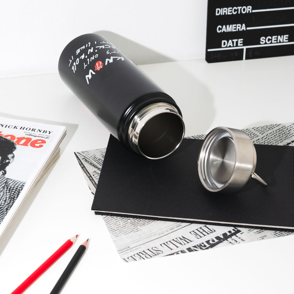 Capacidad: 500ml. Fabricada en acero inoxidable. Incluye tapón hermético con asa.