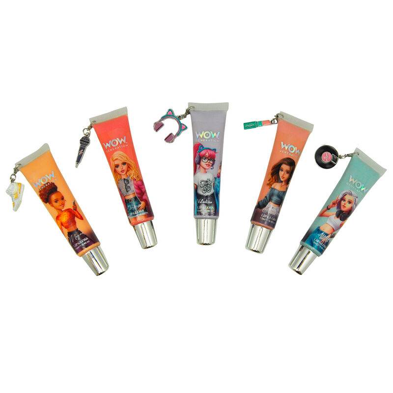 Brillo labial con charm decorativo. Con 5 colores distintos, Lila con charm de auriculares, Rosa claro con charm de labial, Turquesa con charm de disco vinilo, Naranja con charm de zapatilla, Fucsia con charm de micrófono.