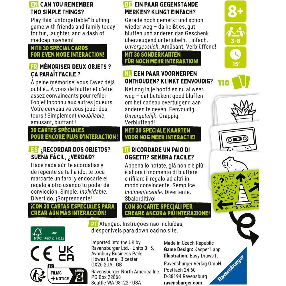 Edad: +8 años. Número de jugadores: 3-8. Duración de la partida: 15 minutos. Al intercambiar regalos, intenta recordar qué regalo tiene cada uno frente a sí. Si no recuerdas qué carta tienes delante, es el momento de hacer un buen farol. Si te descubren o te equivocas, recibirás puntos negativos.