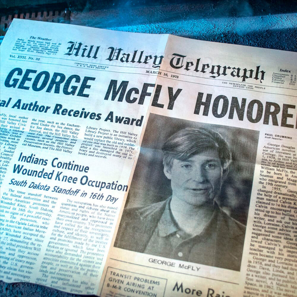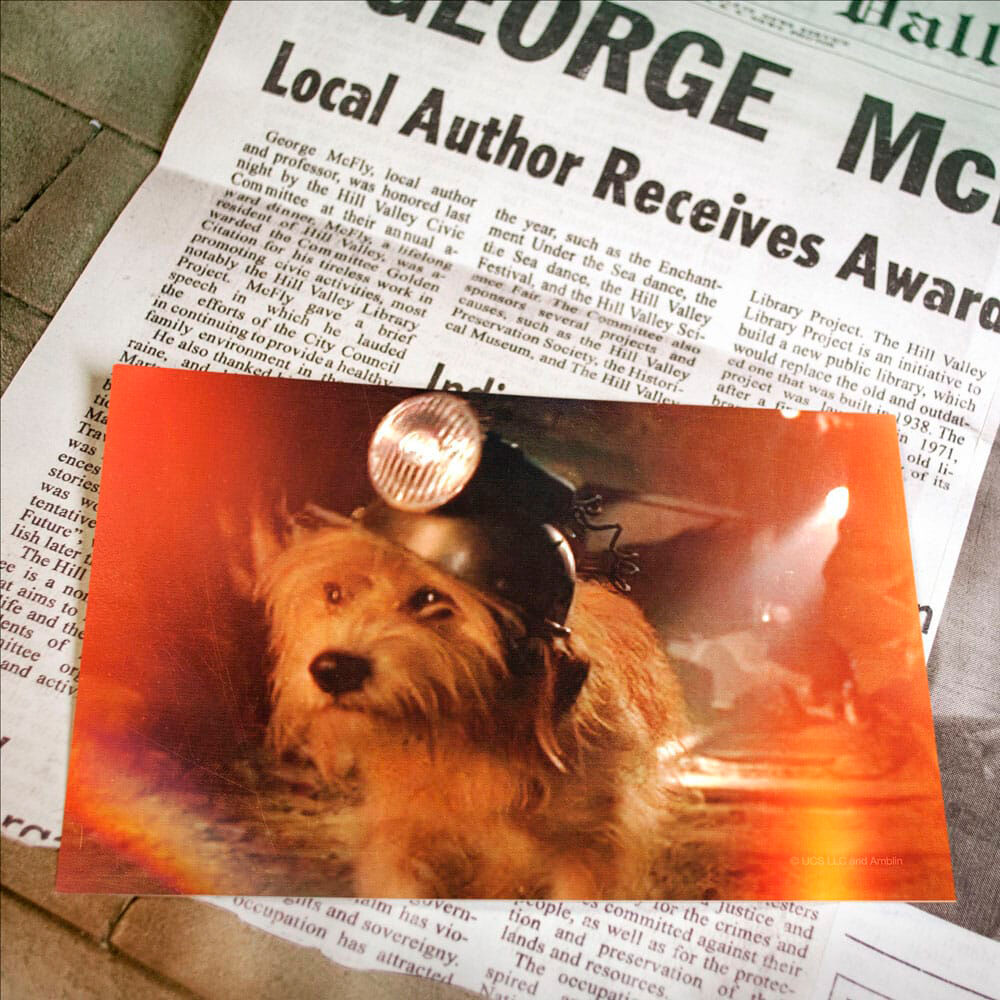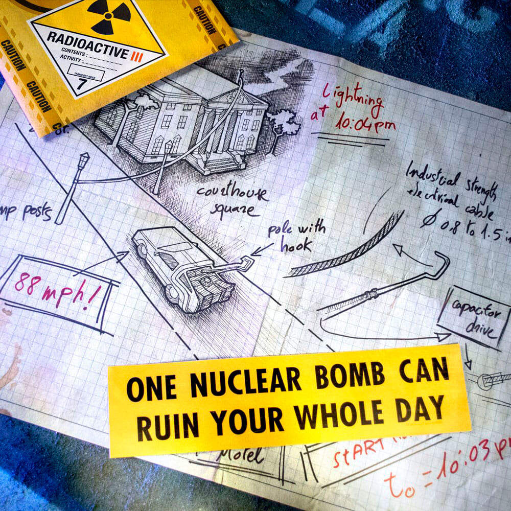 Back to the future. Este kit contiene más memorias que Marty recolectó durante sus viajes a 1955, 2015, 1885 y 1985, recordándole que todas las aventuras vividas junto a Doc fueron reales. El kit está compuesto por 3 sobres con diferente contenido: Sobre Radioactive III: Esquema del plan para usar el rayo que caerá en el reloj de la torre, recorte de prensa del Hill Valley Festival de 1885, recorte de prensa sobre George Mcfly, anuncio de venta del Delorean, pegatina One nuclear bomb, chapa metálica de Einstein, púa de guitarra holográfica de The Pinheads, foto de Copérnico, foto de Einstein, postal Welcome to Hill Valley, foto del reloj de la torre, hoja del listín telefónico con la dirección de Doc y chapa Biff Tannen s pleasure paradise Sobre Dr. E. Brown Enterprises: Plano blueprint Time train machine de 1885, plano blueprint del Delorean de 1985 y plano blueprint del Delorean de 2015. Sobre 1885: Carta de Doc a Marty.