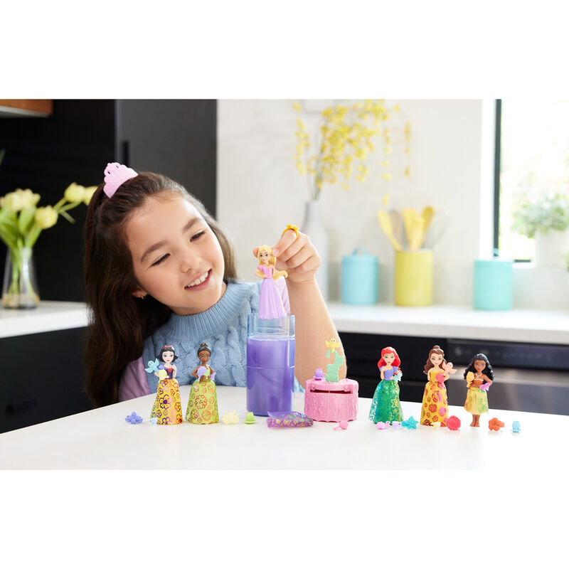 Descubre la magia de las Muñecas Color Reveal Princesas Disney. Este emocionante producto trae un elemento sorpresa que encantará a los más pequeños. Cada muñeca está envuelta en un recipiente que cambia de color con agua, revelando la hermosa princesa en su interior.