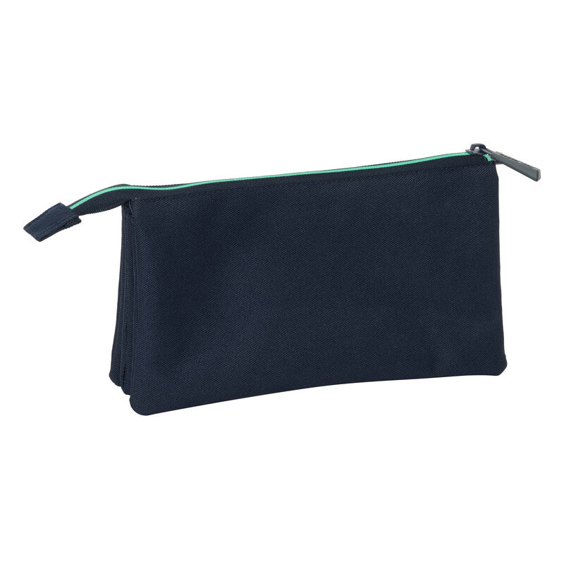 Tamaño: 22x3x12cm. Con 3 compartimentos separados con cremallera. Bolsillo interior central con cremallera.