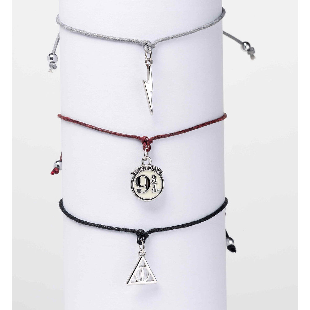 Fabricada en aleación de zinc y cordón de nailon. Plataforma 9 3/4, Rayo y Reliquias de la Muerte Juego de pulseras de la amistad. Aleación de zinc – 93% zinc + 3% cobre + 4% aluminio/Nylon.